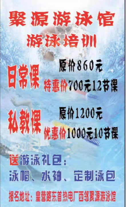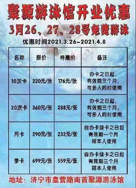 聚源游泳館將于2021年3月26日迎春開館,為答謝新老客戶,聚源游泳館開業(yè)之際3月26-4月8日所售游泳卡一律八折優(yōu)惠。開業(yè)前三天3月26日-28日免費(fèi)游泳啦!敬請(qǐng)廣大朋友相互告知,共赴盛舉。
